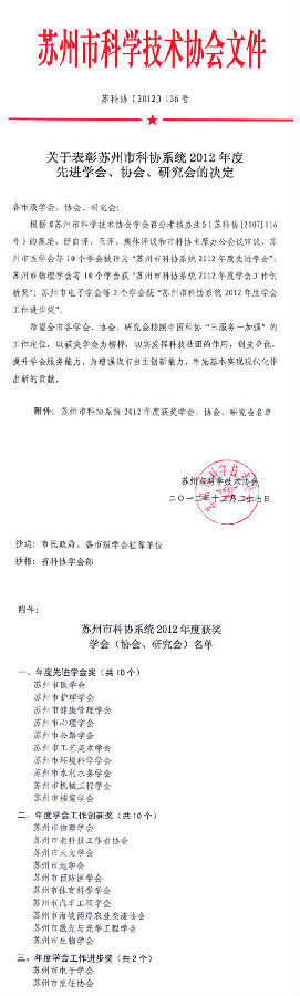 转发《关于表彰苏州市科协系统2012年度先进学会、协会、研究会的决定》