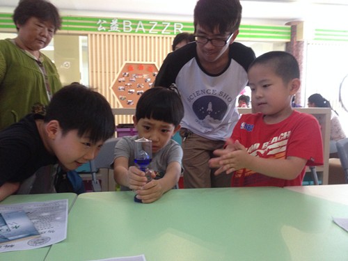 此次活动在区内科普场所昌和公益坊宽敞明亮的活动室举行,参加活动的小朋友和家长都非常兴奋。第一个小实验是漂亮的有蓝色液体的“爱情温度计”。当小朋友们看到大学生志愿者代表孙旭让“爱情温度计”中水晶海豚射出蓝色喷泉,纷纷惊讶地大喊,并要求自己也要试试。大学生科普志愿者们让小朋友搓搓手,提高温度,然后依次让每个人都能够尝试。接着是鱼冼,且不说鱼冼那青铜色已牢牢抓住小朋友的目光,就连家长和其他社区居民也十分好奇这个盆似的青铜器到底有什么科学知识,当大学生科普志愿者告诉大家可以利用共振原理使盆中水飞溅,小朋友们涌上仪器鱼冼前,争先恐后要试,志愿者们让小朋友排好队依次体验,让每个人都能感受科学的乐趣。还有那光栅,看起来就是2张塑料片,讲起来很抽象 ,小朋友们一头雾水,志愿者们巧妙地利用形象具体的有类似结构的椅子讲解。还有光纤,当问起这像什么时,各种奇怪的回答都来了......最后一个是水测试,看着清澈的水,加入试纸后,有的变成黄色,有的变成绿色,大人孩子脑海里会冒出许多许多问号。当然,志愿者们一一解答,不会让大家带着问号回家。