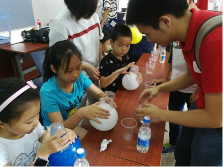 最后压轴的是实验组的“气球托杯子”实验,理论讲解加动手实验,充分调动了小朋友们的积极性。实验利用热胀冷缩的原理,将热水处理过的杯子贴紧在气球表面,可以发现在杯子冷却后会吸附在气球表面。实验组的成员耐心地帮助每一个小朋友完成了实验,实验的成功也给本次活动划上了圆满的句号。
