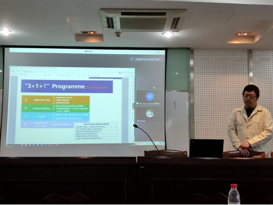 随后,新国大物理系教授王老师通过线上连线的方式就师资力量、研究领域以及系内研究中心和实验室等方面,为同学们介绍了新国大物理系的系内情况。此外,王老师还对本硕联合培养“3+1+1”项目的物理学科做了详细的讲解,希望能够加深同学们对物理科研的兴趣。在王老师宣讲的过程中,同学们听的聚精会神,对“3+1+1”项目和新国大物理系也有了更深一步的了解。