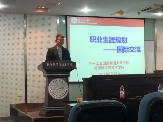 2021年3月17日,苏州大学物理科学与技术学院和苏州工业园区新国大研究院在物科楼409联合举办了职业生涯规划——国际交流项目宣讲会。宣讲会旨在帮助同学们了解国际交流项目和项目申请流程,提高同学们的职业生涯规划意识。参加此次活动的有新加坡国立大学苏州研究院办公室主任杨清华、院长助理丁宁宁、新加坡国立大学物理系教授王学森、学院副院长杭志宏和学院全体2018级、2019级物理学专业本科生。此次宣讲会由学院辅导员郭永坤主持。