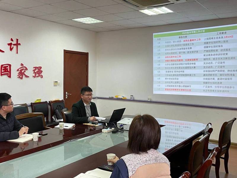 会上各年级辅导员针对所负责年级上学期期末考试情况作了详细分析,并与其他年级同期的成绩作了对比,针对造成现在结果的深层次原因作了剖析,列举了各年级需要重点关注的学生情况。同时,结合学校“8+N”融通计划,就各年级本学期的工作重点做了描述。随后,谢书记部署了本学期学院重点学生工作,希望各班主任利用好基础月进宿舍、进班级、进课堂、进食堂,深入一线联系学生,准确全面的把握班级学生思想状况,重点关注疫情所带来的在生活、学习、心理等方面的影响。