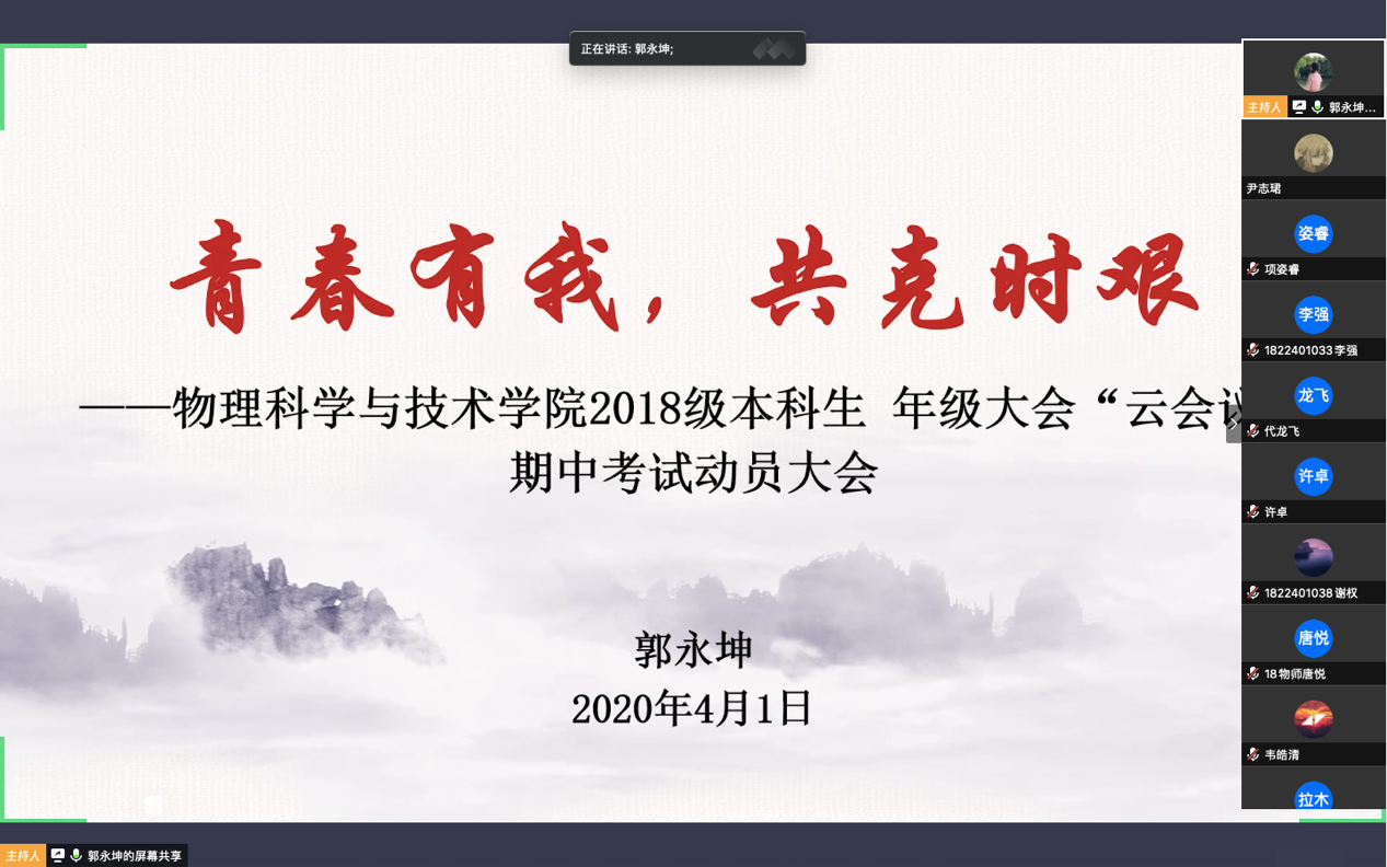 4月1日下午,在全国上下积极抗击新型冠状病毒肺炎疫情的关键时刻,为进一步贯彻落实学校关于新冠肺炎疫情防控要求和相关通知精神,助力打赢疫情防控阻击战,增强防范意识和责任意识,做好期中考试的动员工作,物理科学与技术学院针对2018级本科生召开了一次“云会议”。学院2018级全体本科生参加此次会议,会议由辅导员郭永坤老师主持。