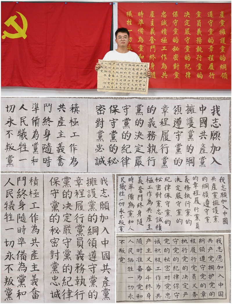 在本次活动中,同学们以书法为载体,抒发了内心对党和国家的热爱之情,进一步强化了初心使命。这一幅幅饱含深情的手书入党誓词,正是同学们对党的二十大最好的献礼。通过本次活动,同学们充分认识到了写好字的重要性以及书法水平在师范生技能中的重要地位。学院美育教育得到广大同学的进一步认同。同学们对党有了更加深刻的认识,决心在党的二十大精神感召下,踔厉奋发,勇毅前行,为成为德智体美劳全面发展的社会主义事业的建设者和接班人而努力奋斗。