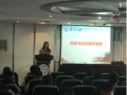 会议伊始,孙书记对全体家长的到来表达了热烈欢迎。随后介绍了苏州悠久的文化历史,诗人张继的《枫桥夜泊》中的姑苏城外寒山寺、“君到姑苏见,人家尽枕河”的古朴风貌、闻名世界的苏州园林、江南水乡古镇、评弹、昆曲、苏绣等等,无一不彰现出苏州是一座文化气息浓厚、人文荟萃、适宜居住的城市。介绍苏州,那么苏州大学是不可或缺的。孙德芬书记介绍了苏州大学悠久的演变历史、校区分布以及苏州大学在世界的排名及学术力量。同时,书记也向家长们展示了物理学院的雄厚的师资力量和最新的学生竞赛成果,向家长们展示了物理学院是一个治学严谨、追求卓越的学院。