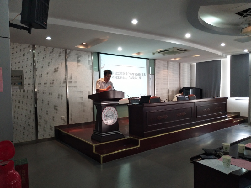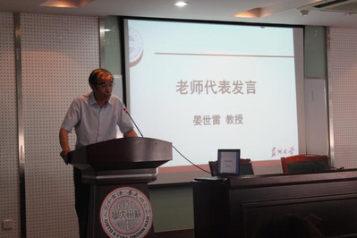 随后教师代表晏世雷教授发言,他用爱因斯坦的话“一个人的成功主要在于业余时间的利用”来教导新同学们要合理安排好自己的时间,做到学习和社会工作并重。此外,晏老师还建议新生加入一些公益组织,并且推荐了大学生创新计划,给新生们指明了前进的道路。