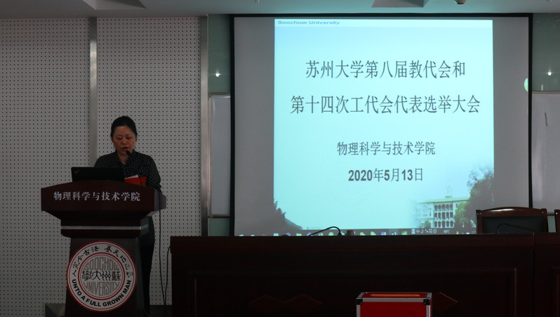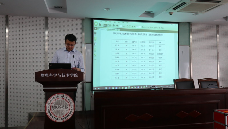 根据学校关于筹备召开苏州大学第八届一次教职工代表大会和第十四次工会代表大会的工作要求,5月13日下午,在物理科技楼409会议室,物理学院召开了“两代会”代表选举大会。会议由学院党委孙德芬书记主持,全体教职工参加了此次选举大会。