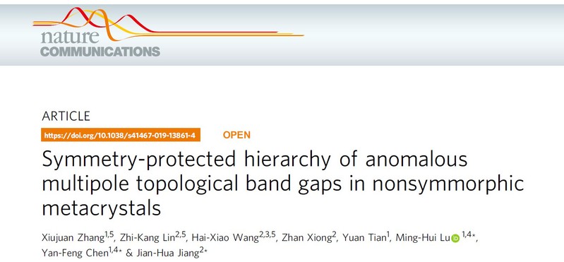 近期,苏州大学蒋建华教授课题组与南京大学卢明辉教授、陈延峰教授课题组合作在高阶拓扑物理领域再次取得重要进展。蒋建华教授首先在理论上提出了一种受非点群对称性保护的新型多级拓扑绝缘体,其不同带隙可以分别支持偶极子和四极子极化,相应地表现出声学类自旋霍尔效应和异常声二阶拓扑现象。在实验方面,南大合作者通过3D打印技术以及相关声波扫场技术,验证了理论预言的相关拓扑效应。文章以“Symmetry-protected hierarchy of anomalous multipole topological band gaps in nonsymmorphic metacrystals”为题发表于近期的Nature Communication。