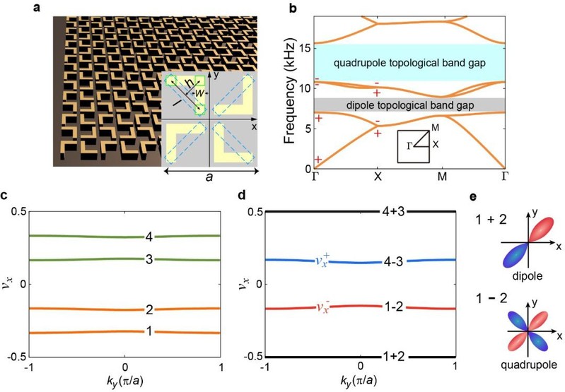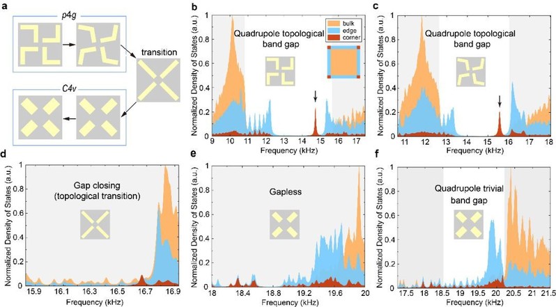 进一步计算结果显示,当结构具有p4g空间群对称性时,其表现出四极子拓扑绝缘体特有的性质,即体带隙中拥有带带隙的边界态和处于边界态带隙中的角态;经过几何相变,体带隙闭合、角态消失;当结构经过几何相变之后具有C4v点群对称性,即便再次打开带隙,带隙中原本由于四极子导致的角态也不再出现,证明几何相变正对应于四极子的拓扑相变,经过拓扑相变,四极子极化消失。由于工作在不同的带隙中(对应于不同的频率)实现不同的拓扑现象,有望在多路复用声传播和声波调制中产生应用。