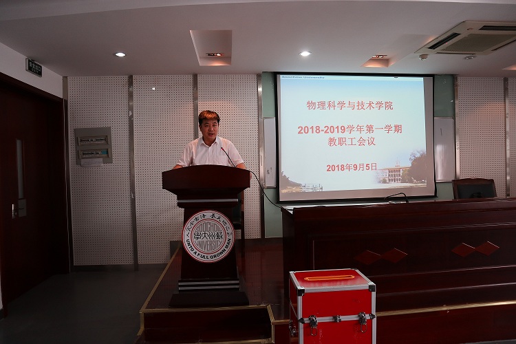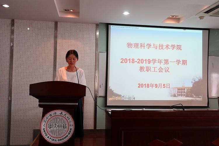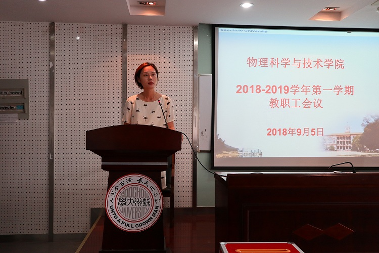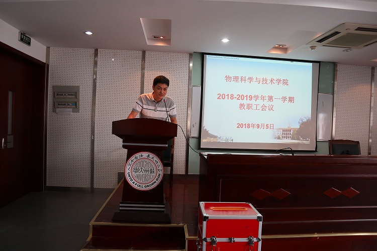 2018年9月5日, 物理学院在物理科技楼409会议室召开了2018-2019学年第一学期第一次全体教职工大会。会议由孙德芬书记主持。孙书记首先向全体教师介绍了学院新的领导班子成员及其分工、行政人员工作分工以及上半年度新引进教职员工。孙书记表示,学院新的领导班子在今后的工作中,将以学院师生为本,在全院师生的监督和支持下,做好各项工作。