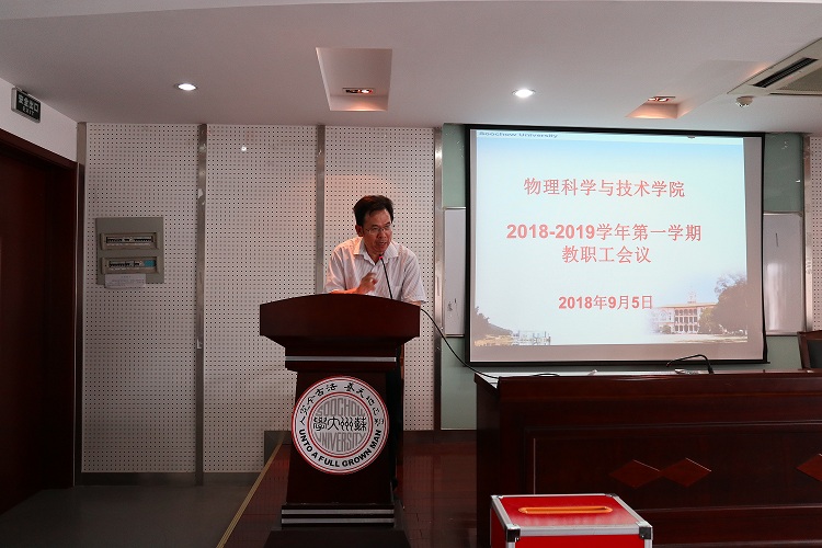 接着,高雷院长结合学院的实际工作,向全院教师传达了学校第五次发展战略研讨会以及全校干部大会的会议精神。高院长指出, 在学校的第五次发展战略研讨会中,校领导指出,学校已经进入转型的关键时期,针对当前存在的突出问题,全校上下要准确把握新技术新产业对传统高等教育带来的挑战,深入领会新形势下高等教育发展的格局和变化,打好内部治理改革、卓越人才培养、一流学科建设、人才队伍建设、科研水平提升、资源增效改革、国际化办学以及便利校园建设等领域的八大攻坚战。学院将结合这些工作重点,结合学校相关政策,进一步解放思想,把此次发展战略研讨会的成果落实到学院的各项工作中。在全院形成解放思想、聚力攻坚、争创一流的良好氛围。同时,高院长就学院本学期的主要工作做了部署,当前要重点做好开学的各项准备工作以及校园安全工作,确保新学期开局良好,各项工作有条不紊。另外对学院近期的研究生推免工作、 物理学品牌专业建设工作、教学科研、人才队伍建设等各个方面工作都做了布置。