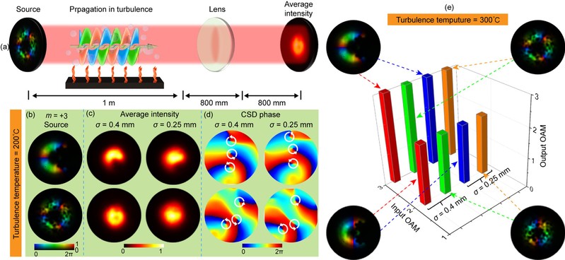 在如图1所示的光路图中,该团队利用空间光调制器加载了被科赫雪花分形结构遮挡的涡旋光束的全息图。实验中利用旋转散射体来调控光束的相干度,使用电热板来产生实验室中的热湍流。在实验的最后部分,为了实验上测量受到扰动和遮挡的部分相干涡旋光束的轨道角动量的大小和符号,利用一个高分辨率的空间光调制器来同时加载三次不同的相位扰动,进而通过全息算法来恢复待测光束的交叉谱密度函数。