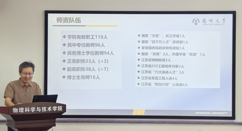 涂育松院长也全面介绍了扬州大学物理科学与技术学院的改革发展、人才培养、科学研究、团学工作等各方面的情况。