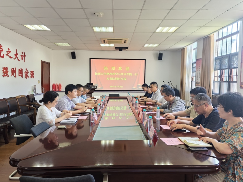 为加强校际交流合作,学习和借鉴兄弟院校的先进经验和成功做法,7月4日,扬州大学物理科学与技术学院党委书记王春雨、院长涂育松、副书记毕瑜林和物理系主任、大学物理部主任等一行8人来我院开展调研交流,在博习楼221会议室召开座谈会。我院杨礼富书记、李亮院长、赵承良副院长、周丽萍副院长、院长助理须萍、综合办主任王迎春等参加了调研座谈会。会议由赵承良副院长主持。