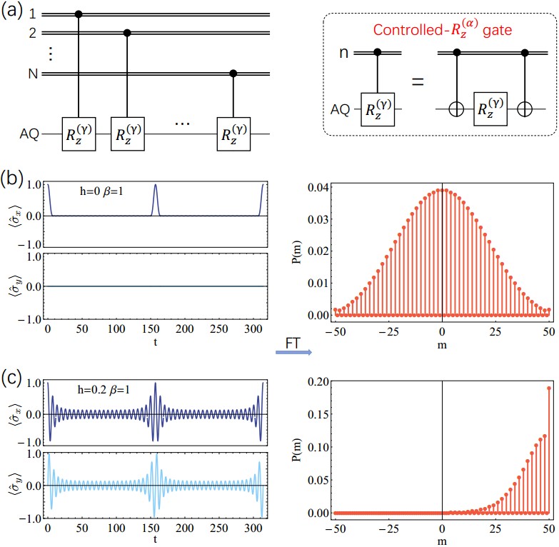 图:(a)利用辅助量子比特探测多体系统磁化分布的逻辑门线路图;(b)(c)左:特征函数;(b)(c)右:磁化分布。