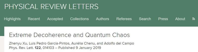 同年1月9日,徐震宇副教授与Luis Pedro García-Pintos博士 (UMass, US)、Aurelia Chenu博士 (DIPC, Spain)、Adolfo del Campo教授(DIPC, Spain)合作,提出了“极端退相干”理论。