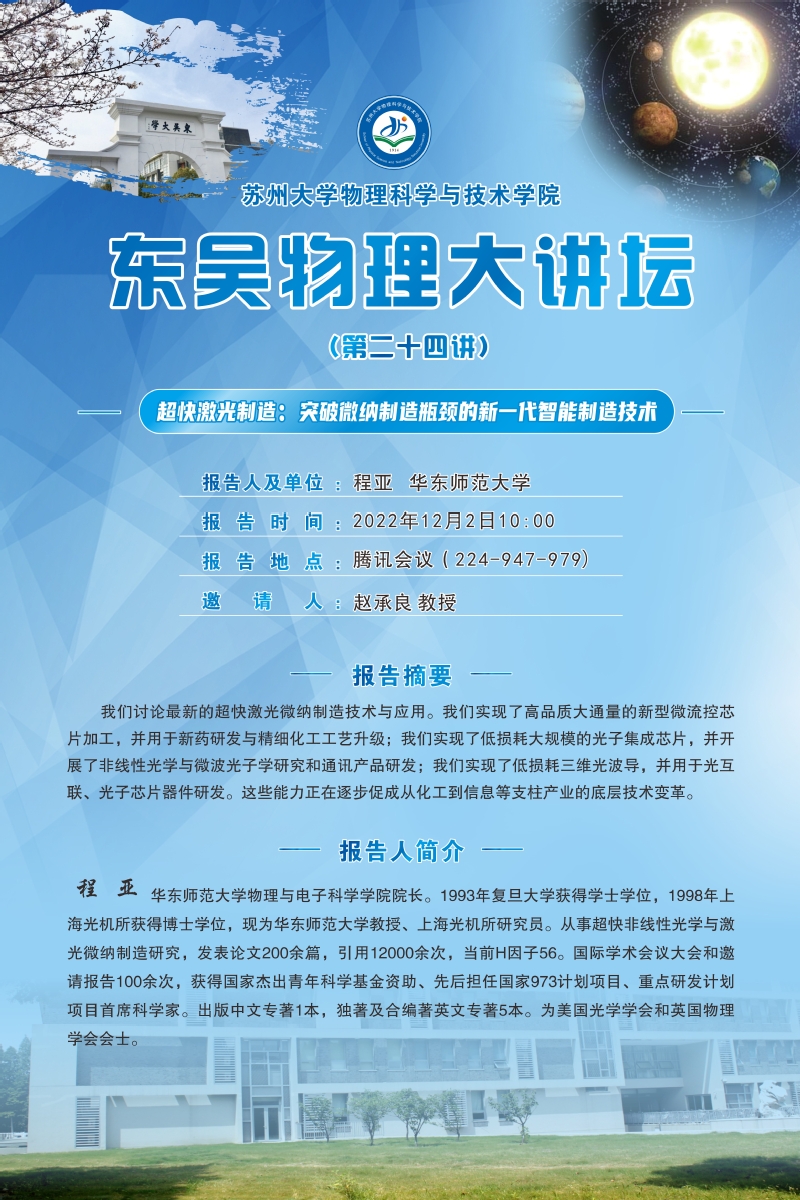 “东吴物理大讲坛”(第二十四讲)——超快激光制造:突破微纳制造瓶颈的新一代智能制造技术