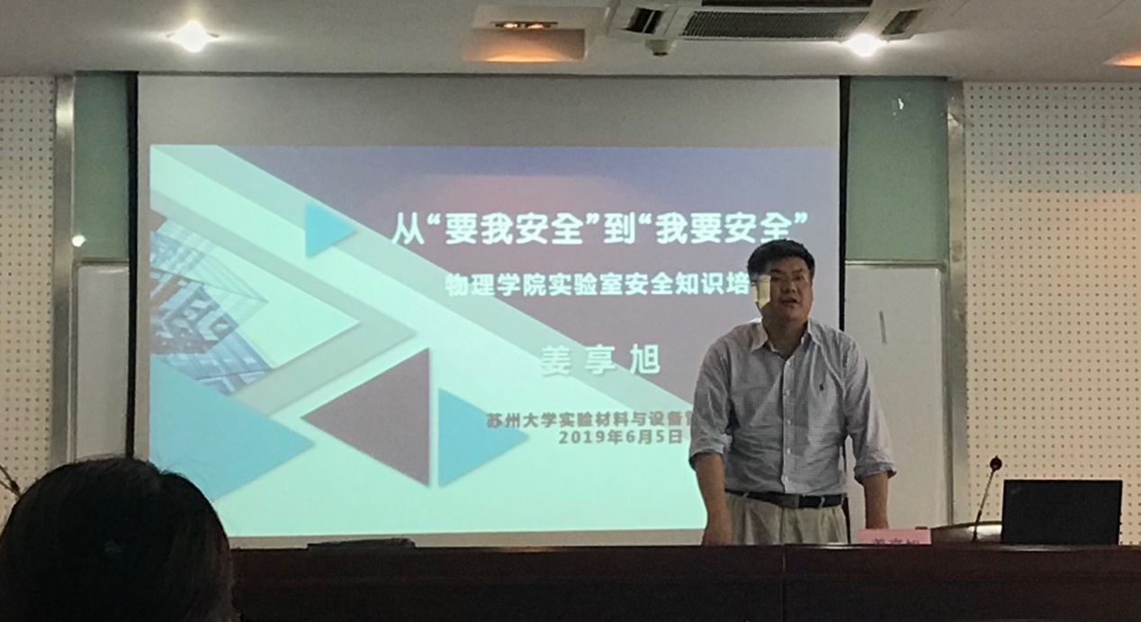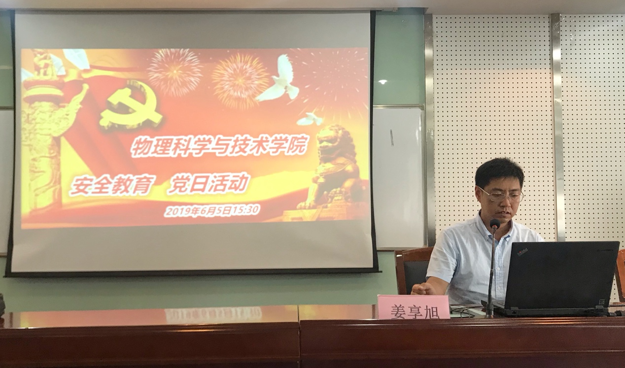 6月5日下午,学院研究生安全教育主题党日活动在物理科技楼409成功举行。学校实验材料与设备管理中心实验管理部姜享旭老师为学院三个研究生支部的全体党员开展了主题为“从‘要我安全’到‘我要安全’”的实验室安全知识培训讲座。学院党委书记孙德芬、研究生辅导员吴亮老师、发展合作办公室主任朱利平老师和全体研究生党员参加了此次活动。讲座活动由学院安全员、交叉中心党支部书记杨朝晖老师主持。