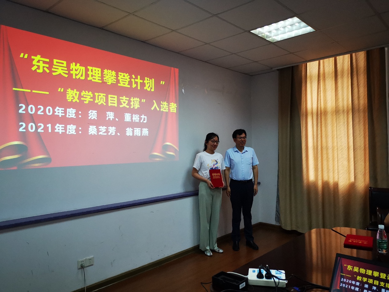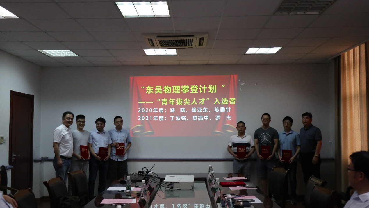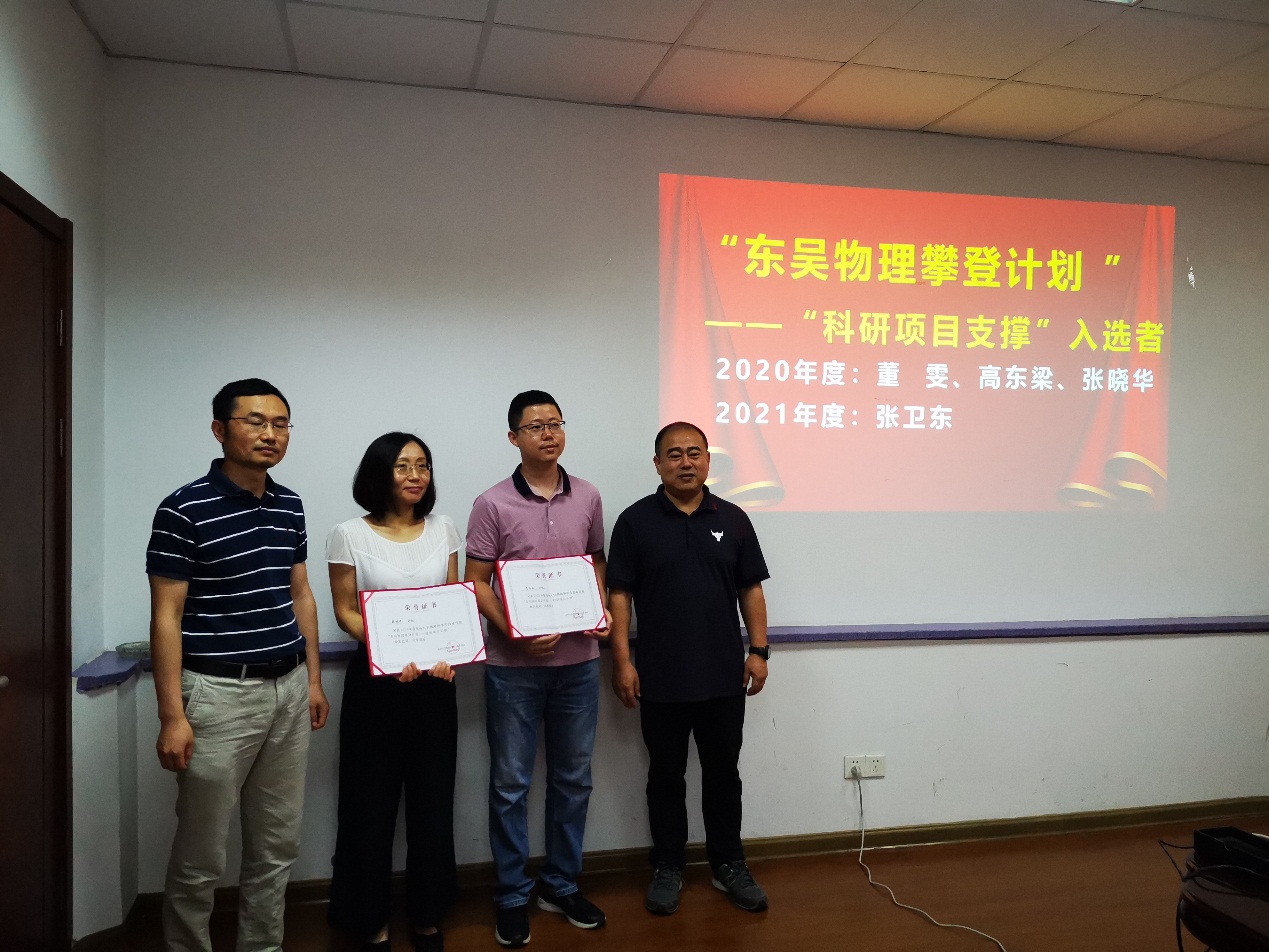 为进一步提升苏州大学物理科学与技术学院的教学和科研能力,营造良好的教学、科研环境,坚持立德树人,激发学院教师教学及科技创新的热情,提高创新能力,学院从2020年开始实施《苏州大学物理科学与技术学院“东吴物理攀登计划”》,支持类别分为“东吴物理青年拔尖人才”“科研类支撑项目”和“教学类支撑项目”。孙德芬书记宣读《关于公布2020年度、2021年度苏州大学物理科学与技术学院东吴物理攀登计划入选者名单的通知》,钱福良处长和龚学锋处长分别为2020、2021年度 “青年拔尖人才 ”入选者颁发证书,仇国阳主任和陈德斌副处长分别为2020、2021年度“科研项目支撑 ”入选者颁发证书,高雷院长为2020、2021年度“教学项目支撑 ”入选者颁发证书。