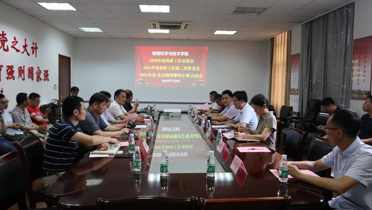 为推动苏州大学物理科学与技术学院科研创新工作的高质量发展,梳理学院科研工作的基本情况,理清现阶段科研工作存在的优势与不足,更好地促进物理科学与技术学院下一步科研工作的高效有序推进,物理科学与技术学院2020年度科研工作表彰会、2021年度科研工作第二次推进会、2021年度“东吴物理攀登计划”启动会于7月8日上午在天赐庄校区博习楼221会议室召开。校科学技术研究部郁秋亚部长、科学技术处钱福良处长、科技成果转化处龚学锋处长、“2011计划 ”办公室仇国阳主任和军工科研处陈德斌副处长出席此次会议,物理科学与技术学院高雷院长、孙德芬书记、杭志宏副院长、李亮教授、蒋建华教授、徐亚东院长助理,及各系所中心负责人、支部书记,“2020、2021年攀登计划入选者 ”,相关教师参加此次会议。会议由物理科学与技术学院赵承良副院长主持。