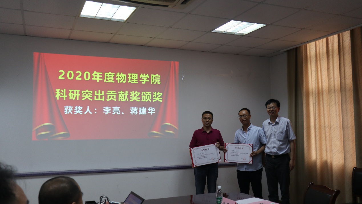 为表彰先进、树立标杆,激励全院师生勇攀科学高峰、奋勇争先,加快推进学院科研事业的高质量发展,决定授予李亮、蒋建华两位教授为2020年度苏州大学物理科学与技术学院科研工作突出贡献奖获得者称号。高雷院长宣读《关于表彰2020年度苏州大学物理科学与技术院科研工作突出贡献奖的决定》,郁秋亚部长为获奖者颁发证书。