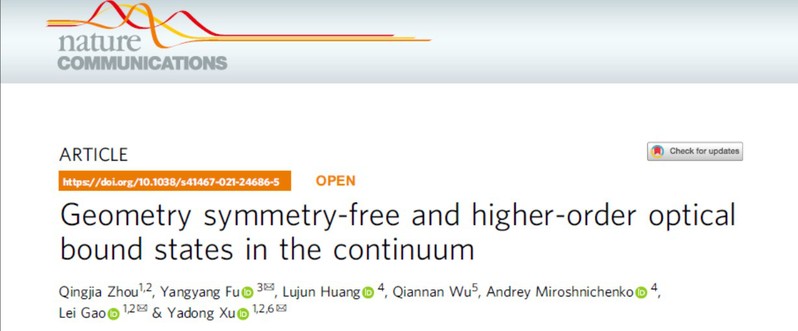该研究成果以《Geometry symmetry-free and Higher-order Optical Bound States in the Continuum》为题发表在Nature Communications上。苏州大学物理科学与技术学院徐亚东教授、高雷教授和南京航空航天大学伏洋洋副研究员为共同通讯作者;苏州大学物理科学与技术学院博士生周庆佳为论文的第一作者。该工作得到了国家自然科学基金、江苏省自然科学基金、中国博士后科学基金、江苏省优势学科等项目的支持。