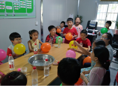 最后,孩子们迎来了最喜欢的实验环节,气球托杯子。简单的实验原理介绍之后,聪明的小朋友们纷纷领取了自己的实验材料,迫不及待自己行动起来。随着气球吹至饱满,矿泉水瓶被灌入热水,实验的准备工作已然完成。清空水瓶后,小朋友的小手快速而稳定地将空瓶口用气球掩住,双眼紧紧盯着瓶口,耐心的等待着热胀冷缩奇迹的发生。小屋一时安静下来,只有大家期待的呼吸声。伴随着一声低呼,已经有第一个水瓶被气球提了起来,很快,桌子周围一圈都是在气球下悠悠晃动的水瓶了,一时间小屋又充满了快活的气氛。窗外,等候的孩子家长也露出了欣喜的微笑。