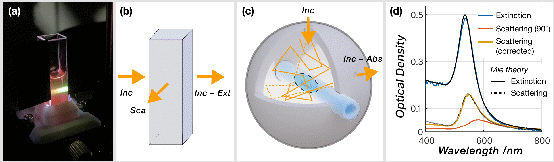 Figure 1: (a) Photograph of a cuvette with a solution of Au nanospheres, showing a strong colour variation along the beam path. (b) Schematic of extinction and scattering measurements of liquid samples in a standard cuvette. (c) Absorption spectroscopy setup enclosing a liquid sample inside an integrating sphere. (d) Extinction and scattering spectra for 60 nm Au spheres in water.