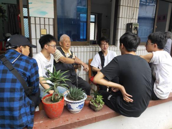 (团队成员与老人交谈 通讯员王梅摄) (团队成员听蒋爷爷讲故事 通讯员项姿睿摄)