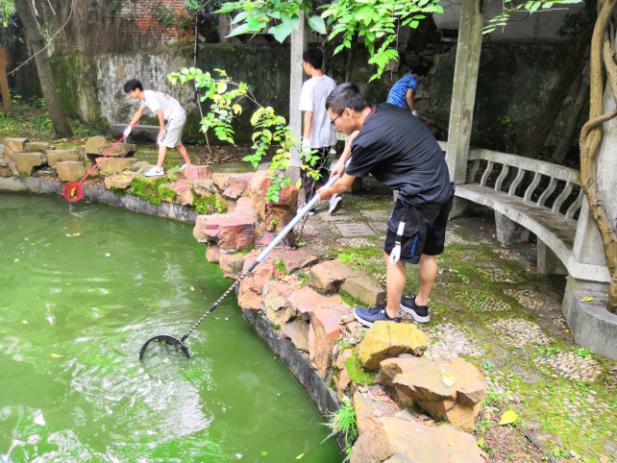 (团队成员在打捞杂物 通讯员杨庭妍摄)(团队成员和老人一起做手工 通讯员杨庭妍摄)