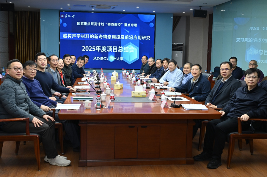 2026年1月17日至18日,国家重点研发计划“物态调控”专项项目“超构声学材料的新奇物态调控及前沿应用研究”(编号:2022YFA1404400)2025年度总结会在苏州大学独墅湖校区成功举办。该项目由苏州大学作为牵头承担单位,由我院蒋建华教授主持。项目责任专家:南开大学许京军教授、南京大学王慧田教授,指导专家:南京大学陈延峰院士、苏州实验室陈弘达部长、东南大学孙立涛副校长、山东师范大学蔡阳健副校长、苏州城市学院高雷副校长、南京大学王牧教授、南京大学金飚兵教授、华中科技大学陆培祥教授、中科研物理研究所翁红明研究员和南开大学金亮教授等10位专家学者应邀参会。来自南京大学、同济大学等合作单位的2